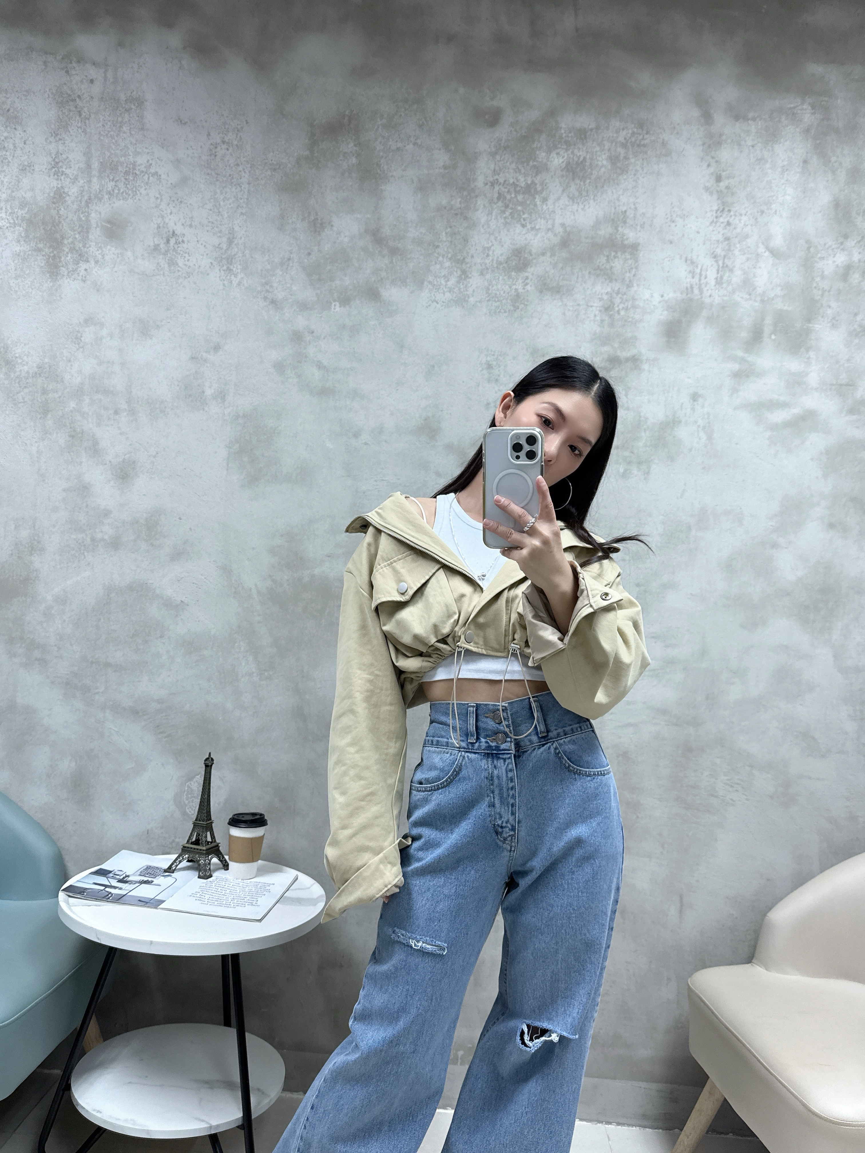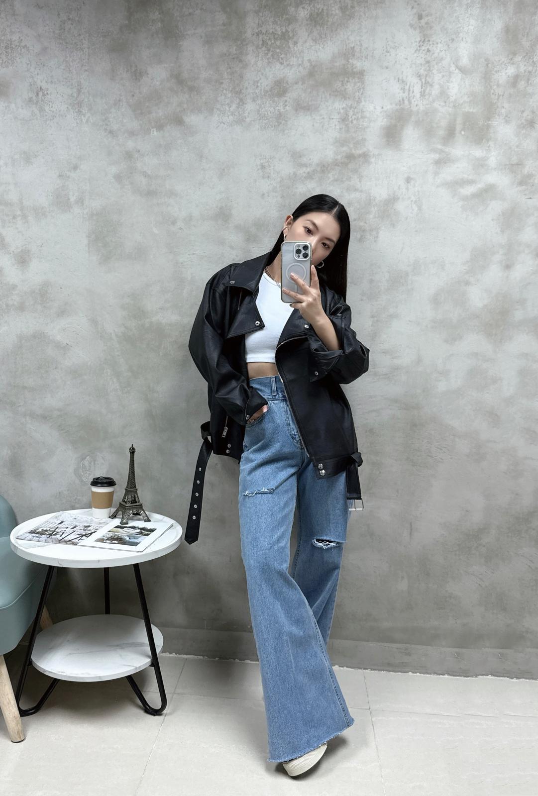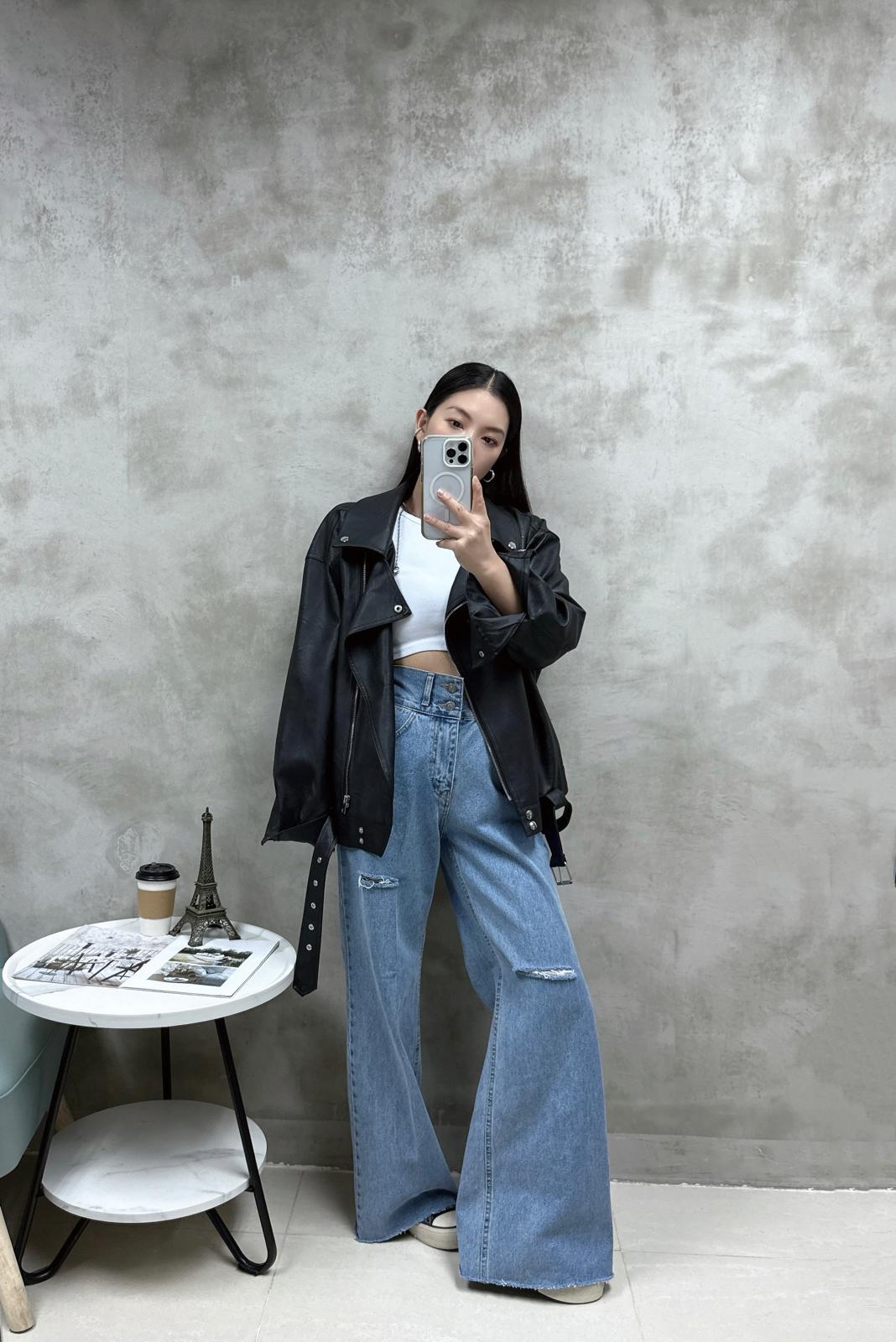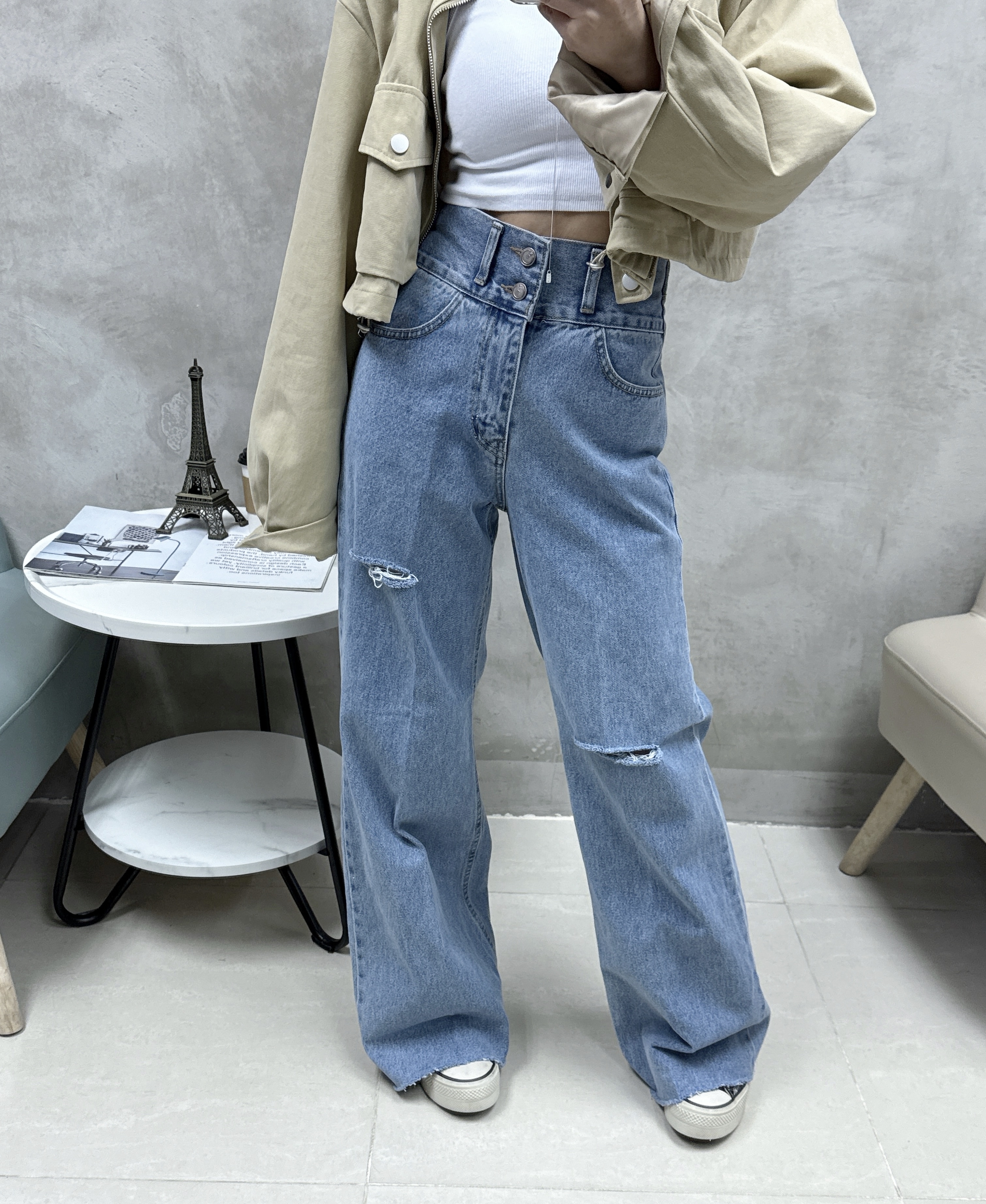 F25 雙鈕洗水介爛牛仔褲